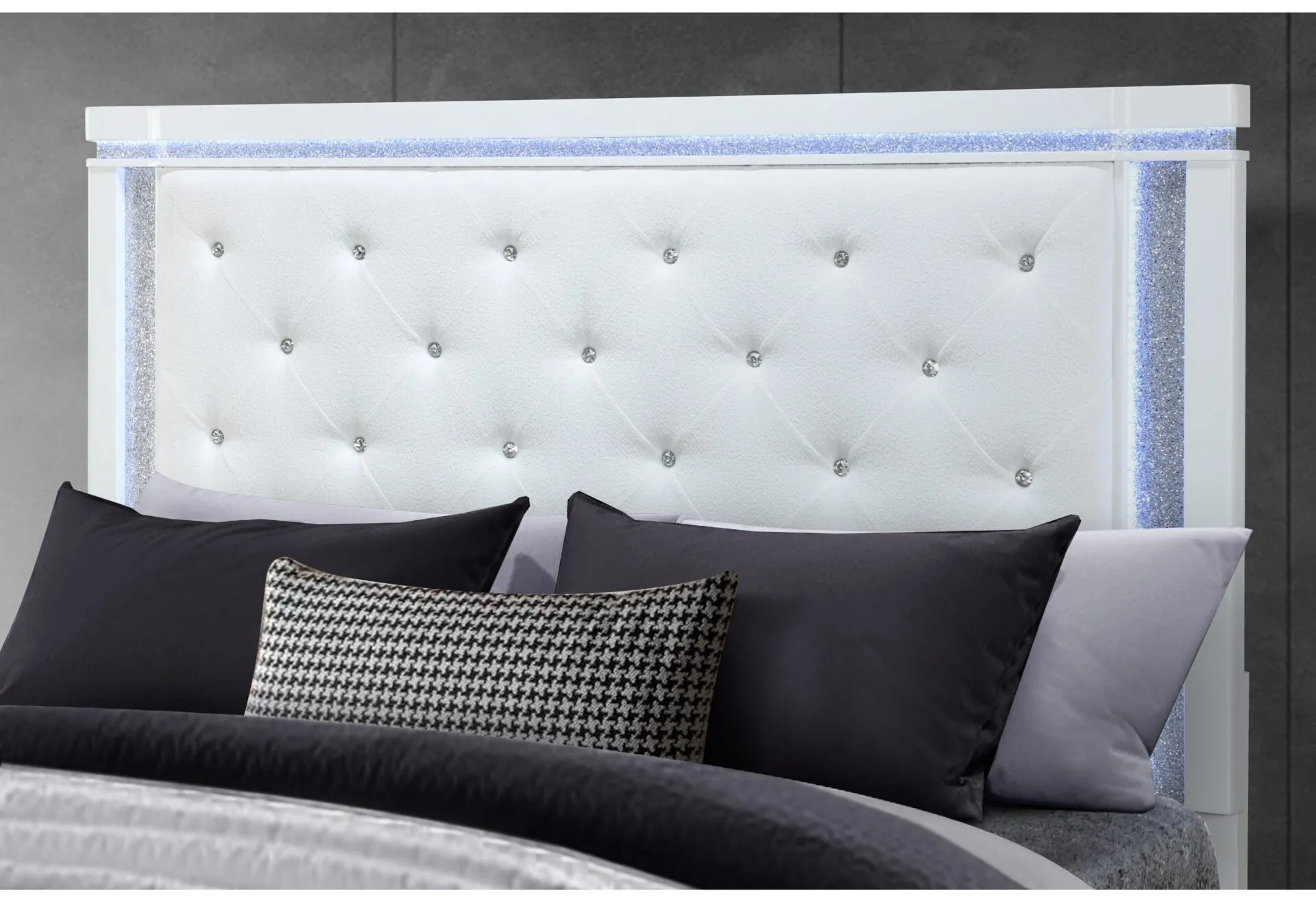 Elevate your bedroom with a collection designed to make a statement. A luminous white finish sets the tone, while subtle LED accents highlight shimmering details that bring a soft glow and refined glamour to the space. The bed features a tufted upholstered headboard and footboard with crystal-inspired accents, creating a stunning focal point that feels both elegant and inviting.