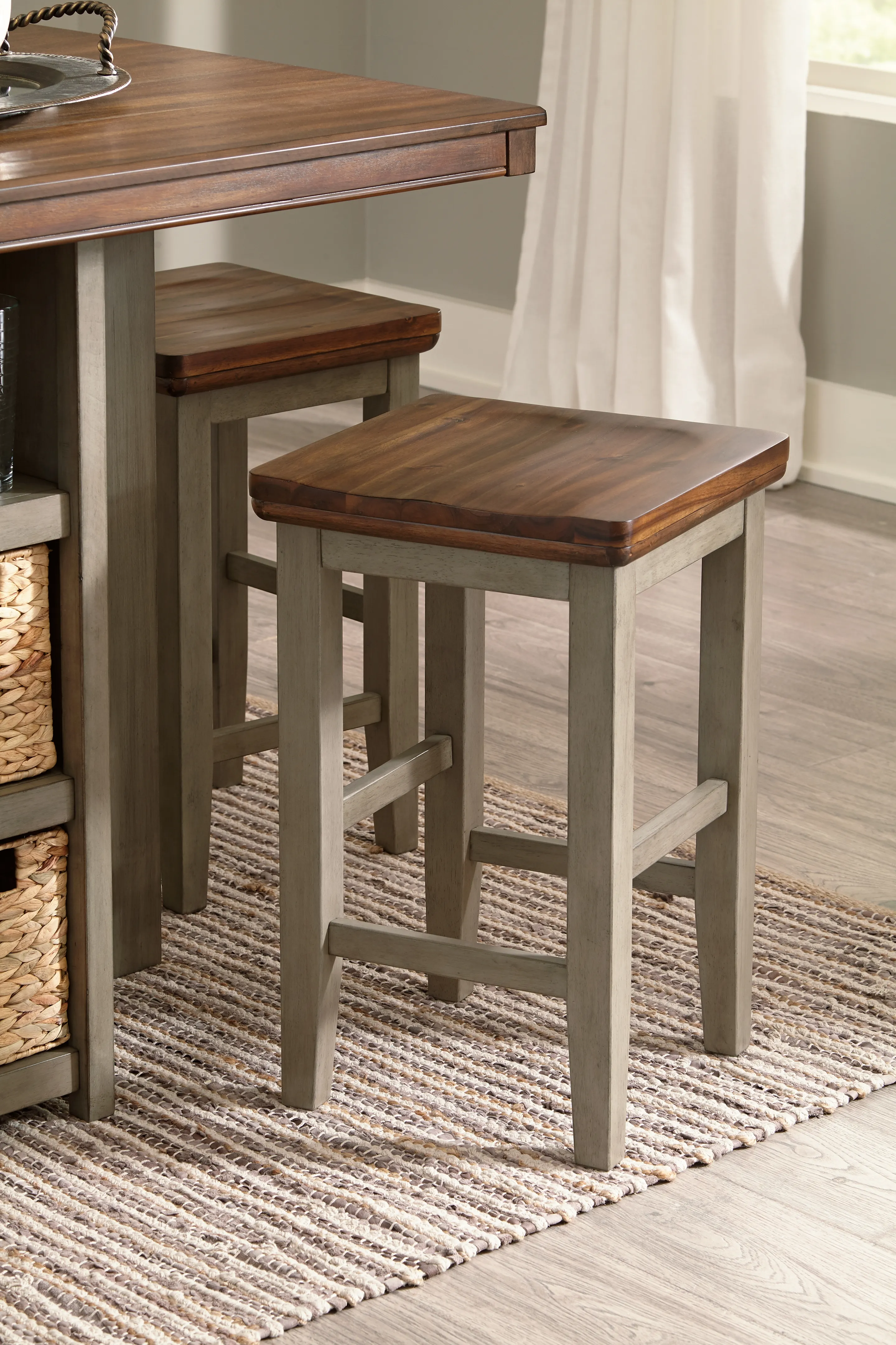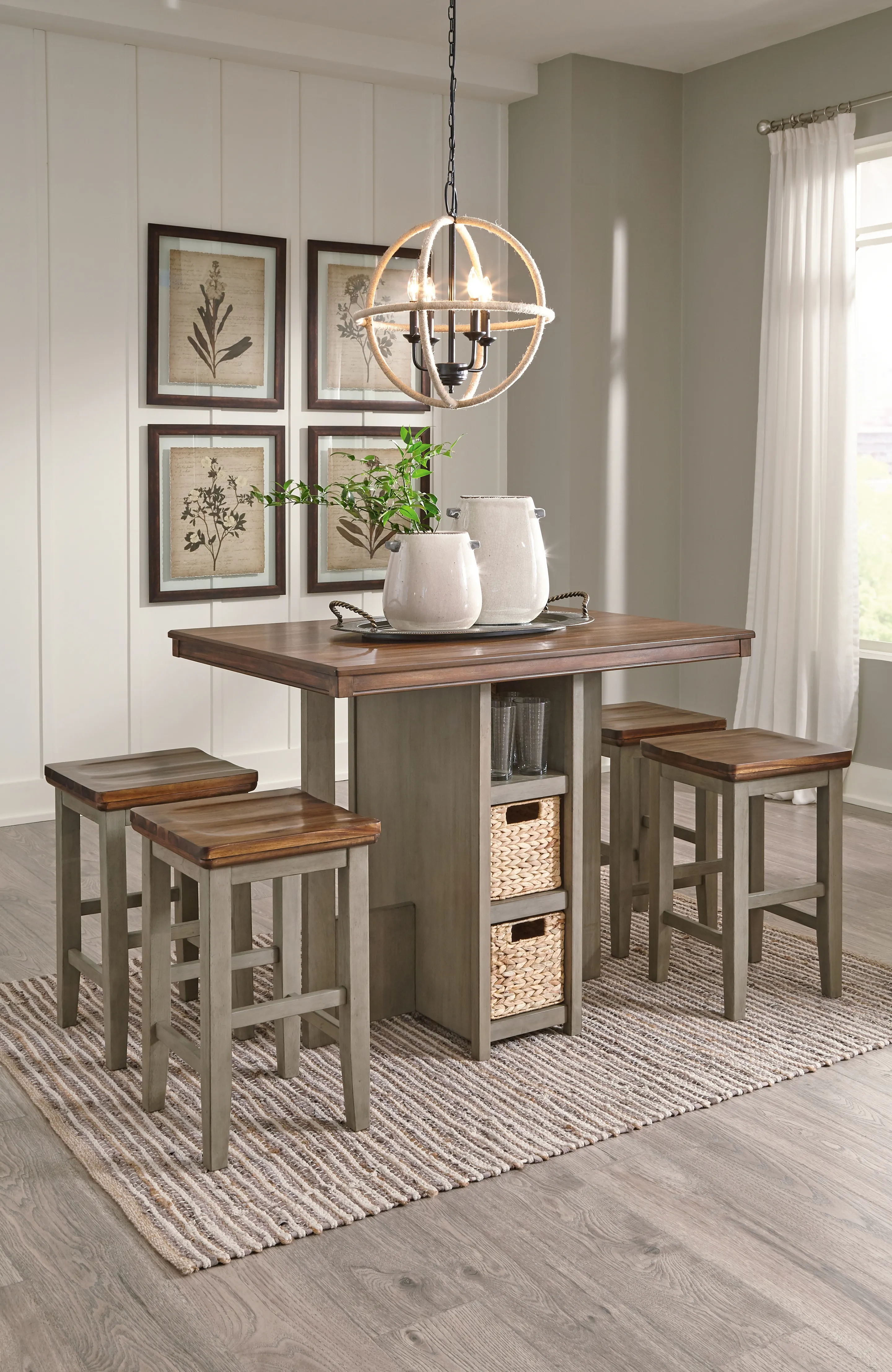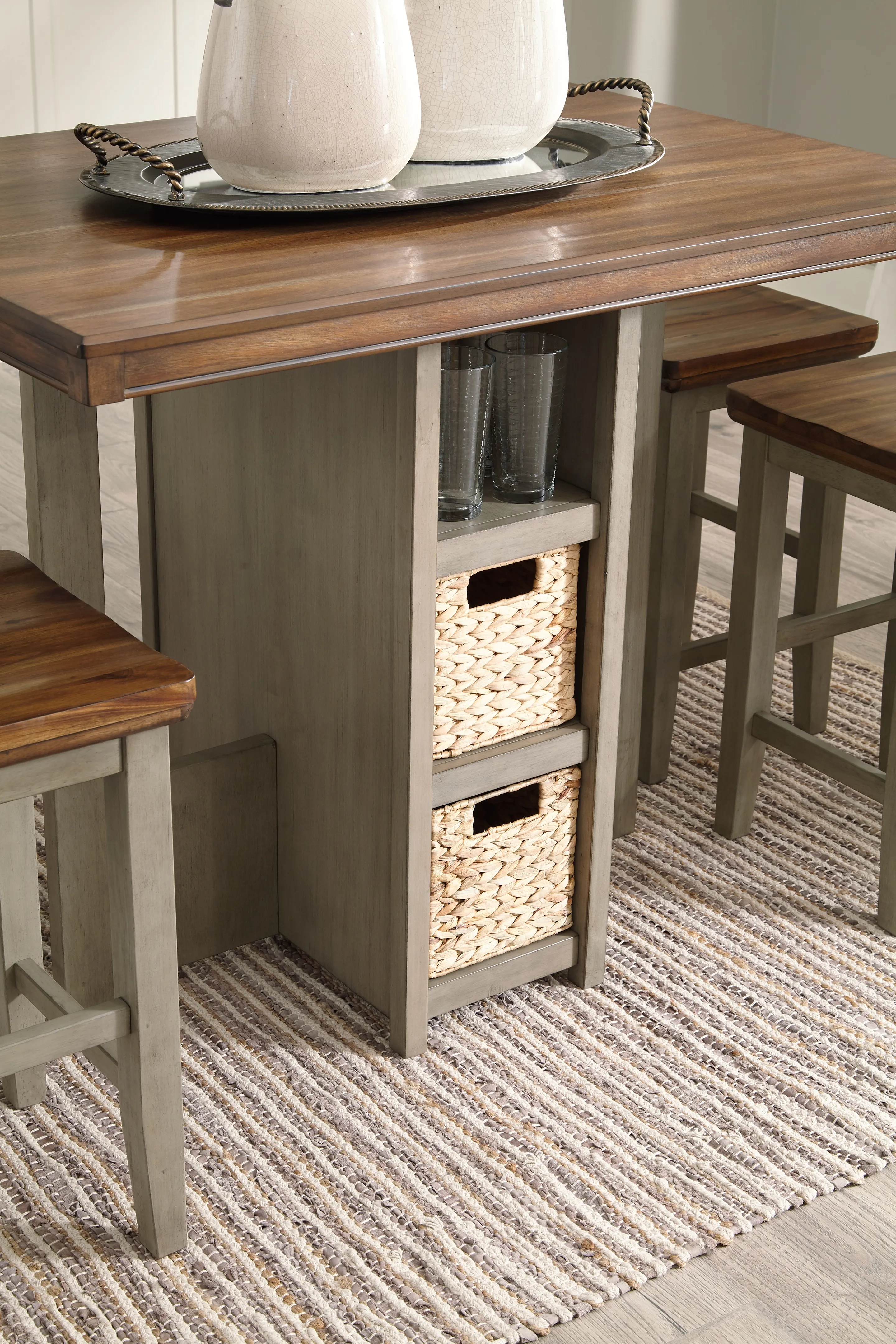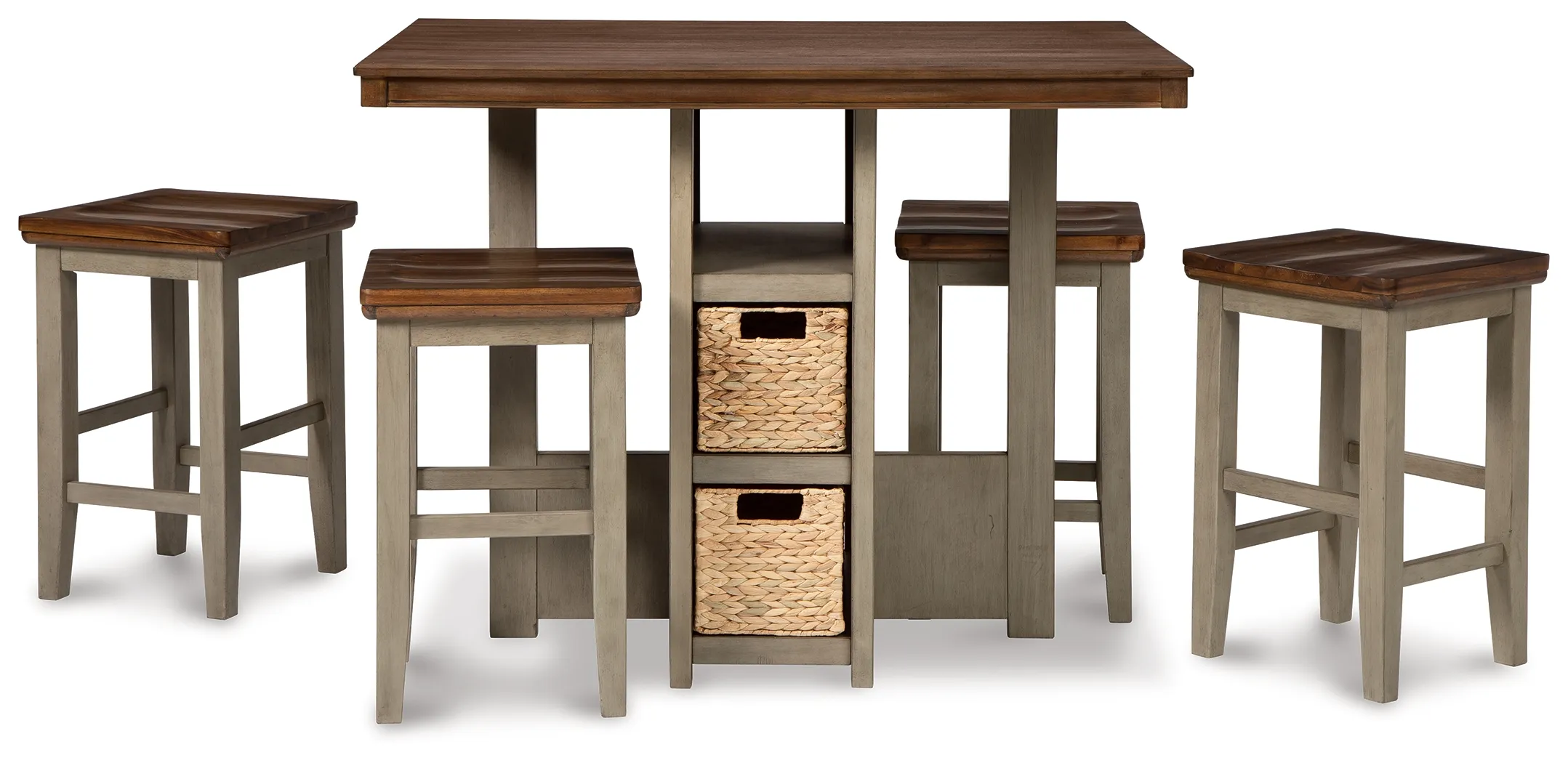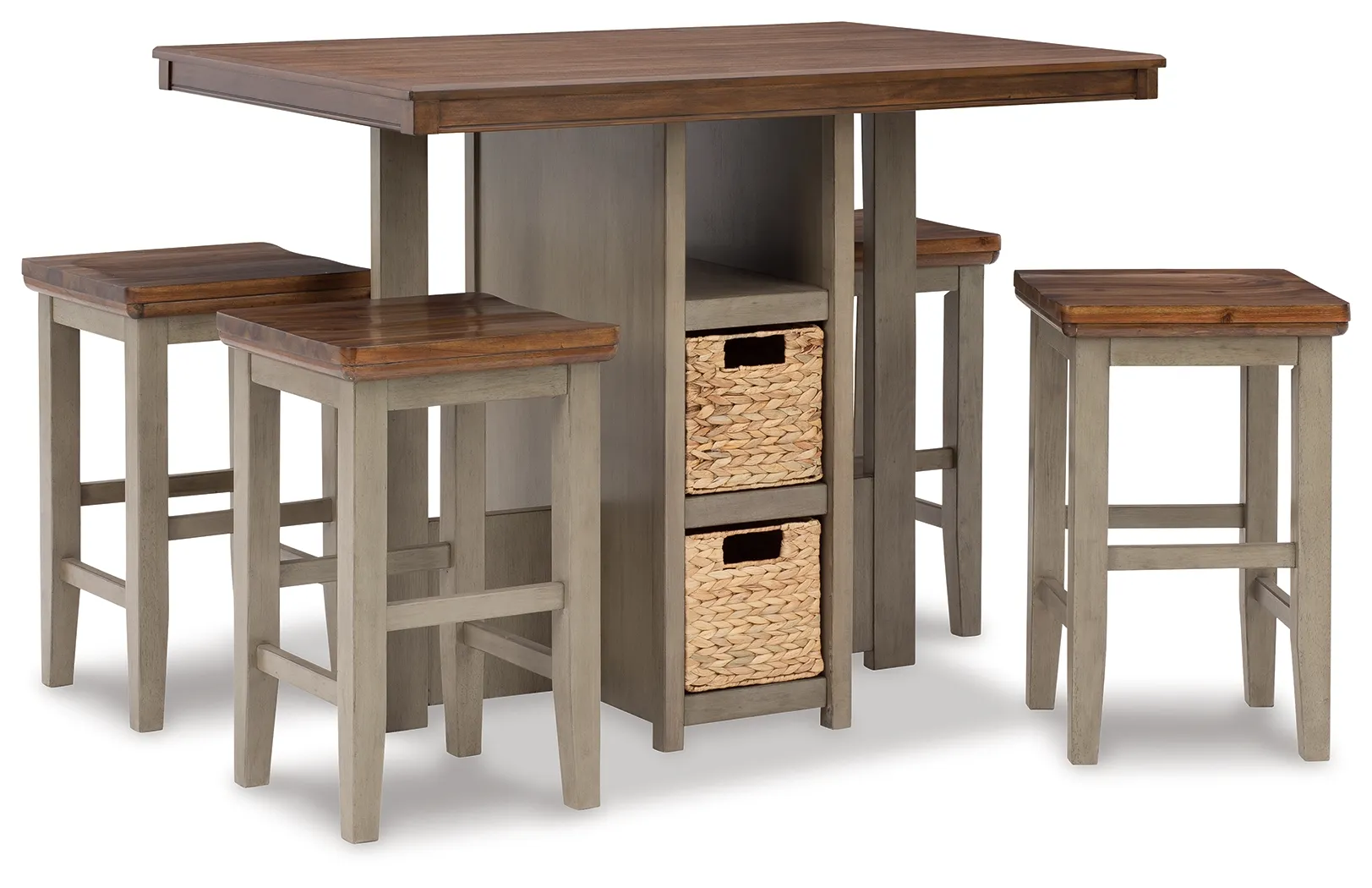 Break from tradition with a fresh approach: this counter height dining set's two-tone vibe is deliciously different. Crafted with acacia veneers for wonderful color variation, the light brown top is paired with a brilliantly styled base for a high-contrast aesthetic that's right on trend. Open shelving with four neatly fitted baskets makes this easy-elegant dining table all the more inviting.