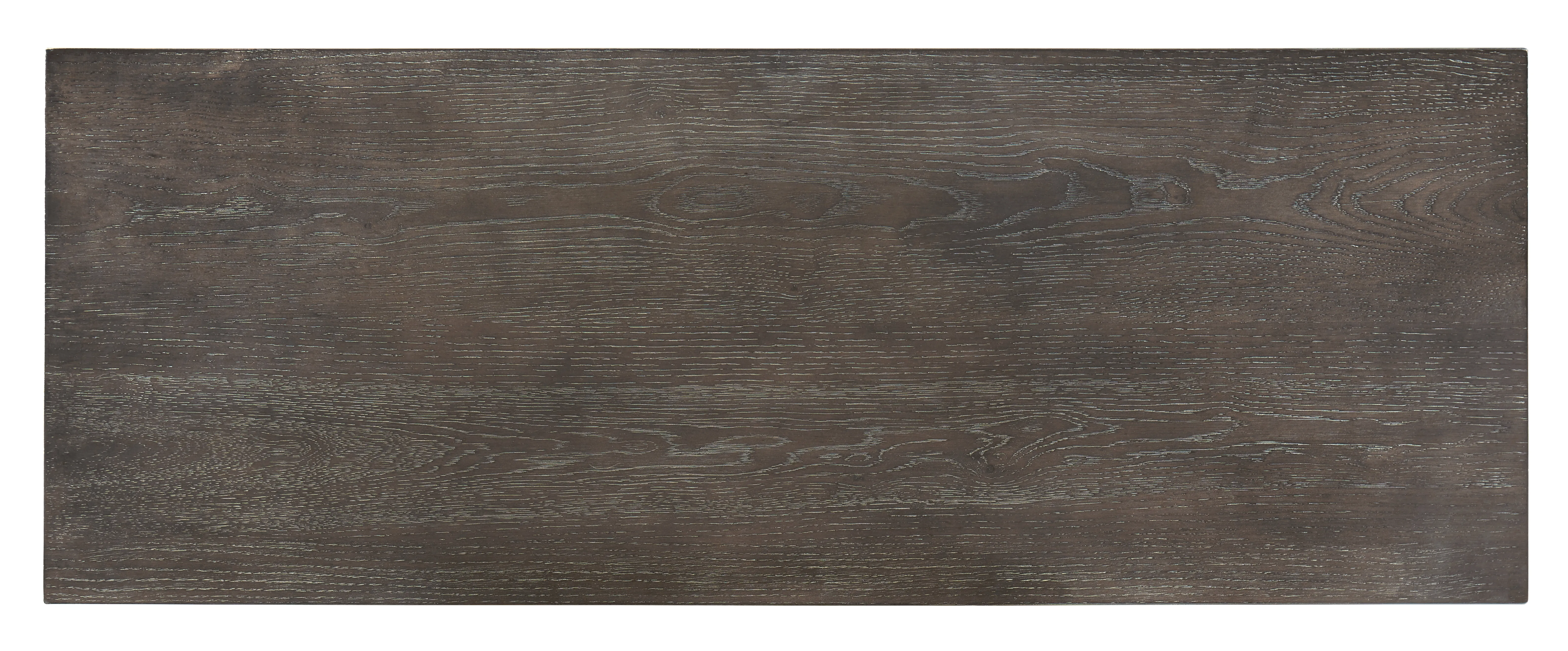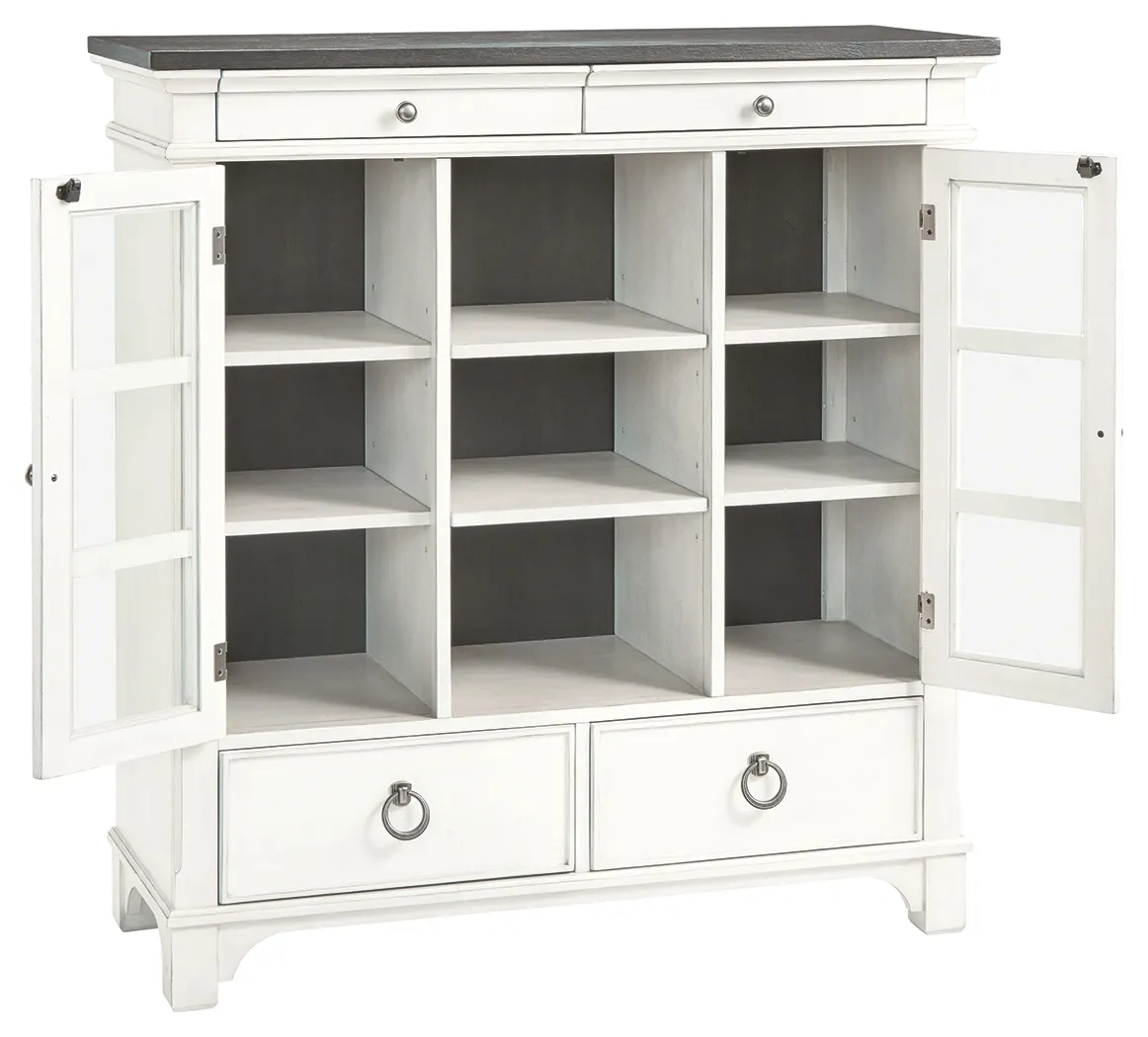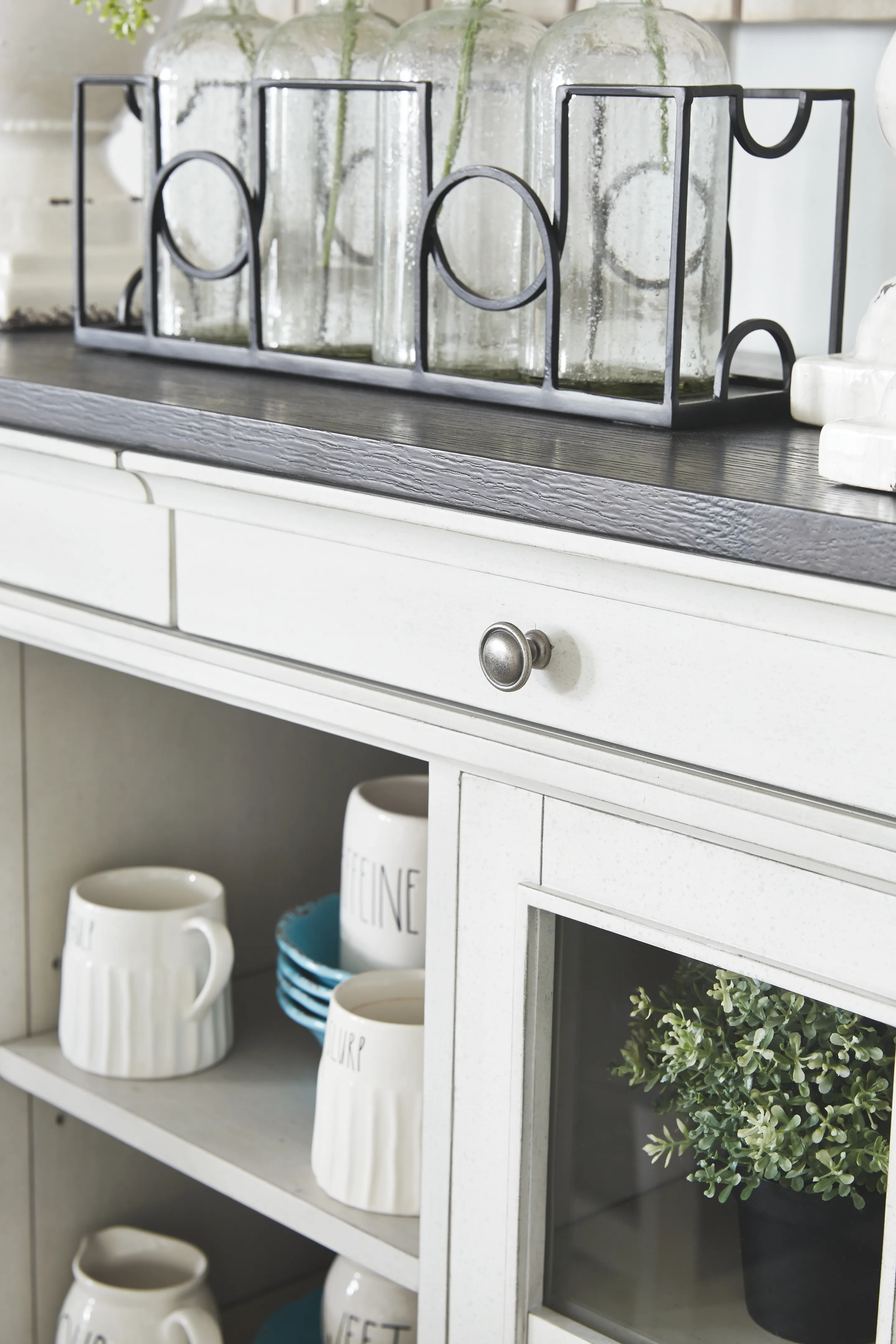 We love how this dining room server gives classic cottage-style charm a fresh makeover. Oak veneer top is treated to a rich brown finish and a weathered gray texture that raises the bar on casually cool dining. Four drawers and a combination of open shelving and glass-front cabinets offer plenty of space for storing table linens, plates and stemware. A distressed whitewashed finish heightens the farmhouse appeal.