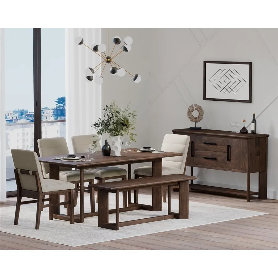 Sleek contemporary lines with intriguingly angled legs may catch your attention but the details of the Ronan collection will draw you in. Mango veneers applied over hardwood solids are polished off in a rich brown finish that flaunts the deep natural variations of the wood grain. Gently rounded edges pair with soft, textured fabric on the fully upholstered chairs and stools with tufting and exposed back frame details. In dining and gathering heights and a matching server, the Ronan collection proves that elevated and sophisticated can also be warmly inviting.