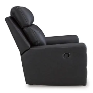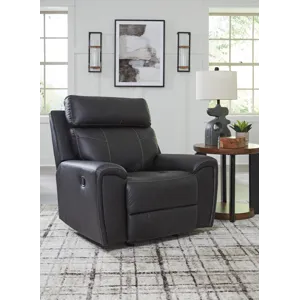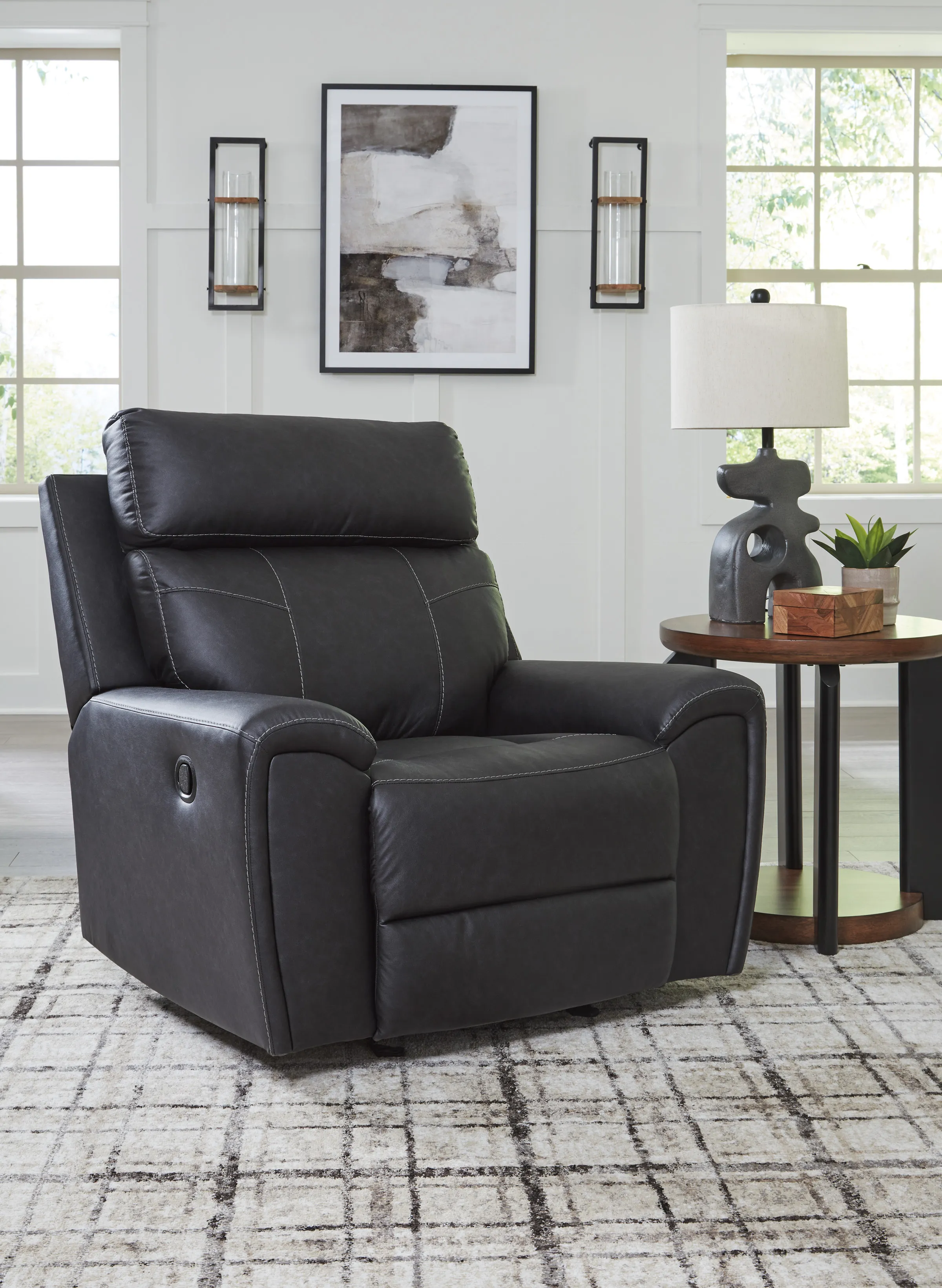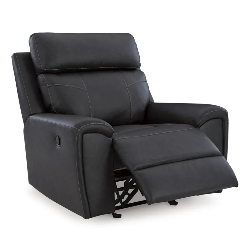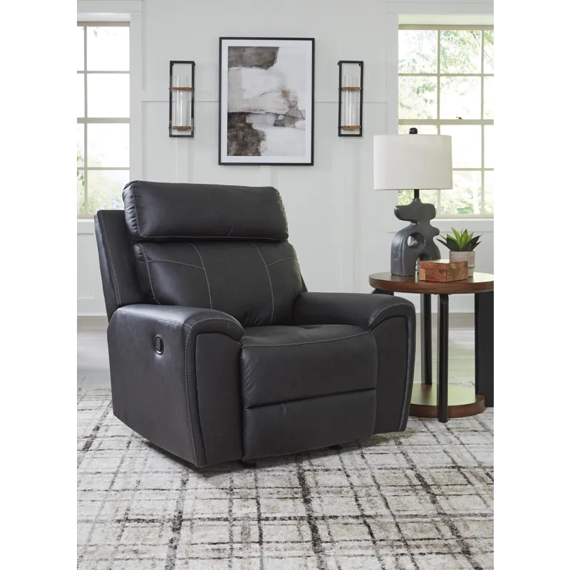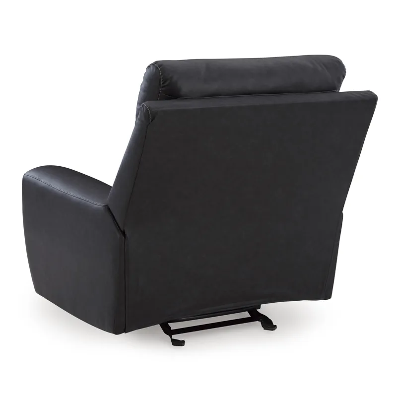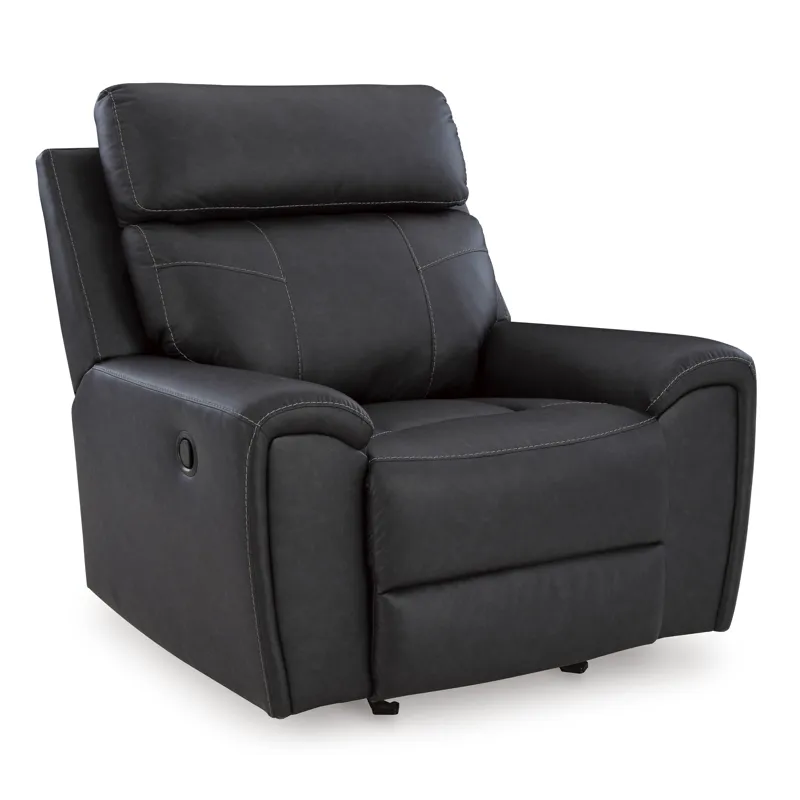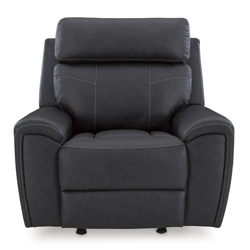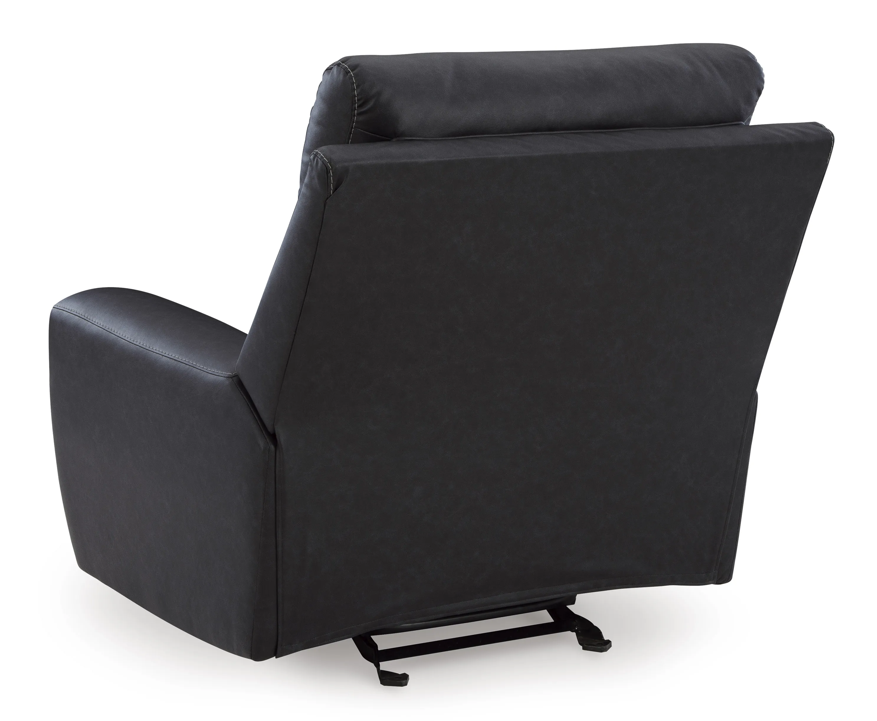 Recline in exquisite design. An on-trend addition for modern spaces, this glider recliner welcomes you with style. It's dressed to impress with sleek track arms and a bustle back. Soft faux leather upholstery provides the upscale look you want for less. And the relaxing smooth-gliding motion takes comfort to another level.