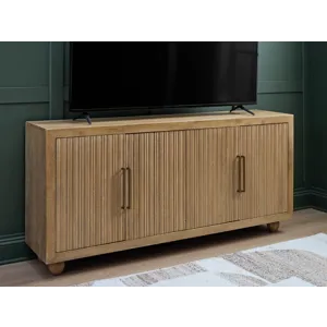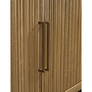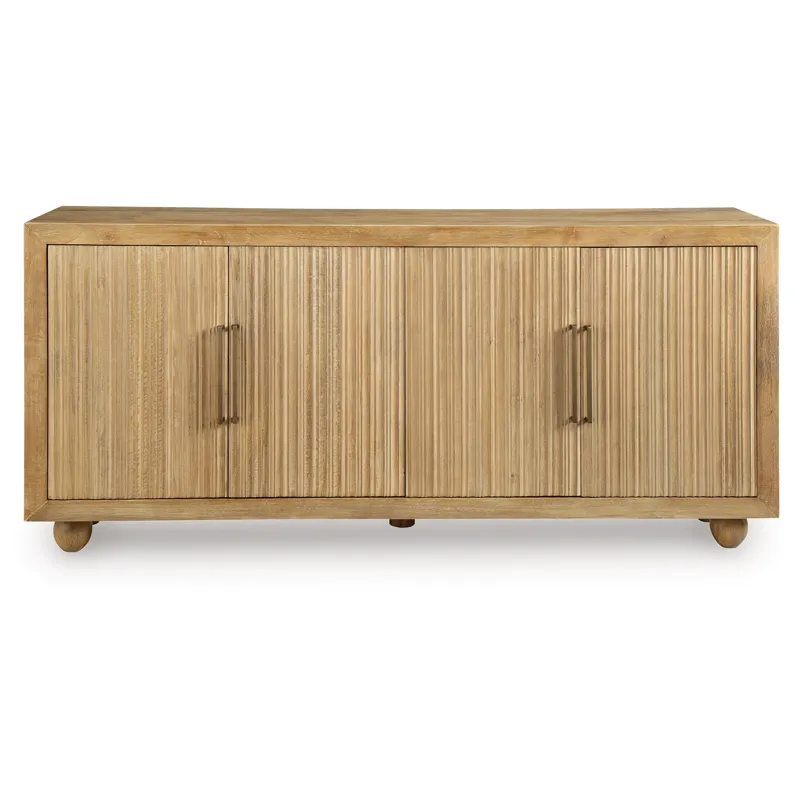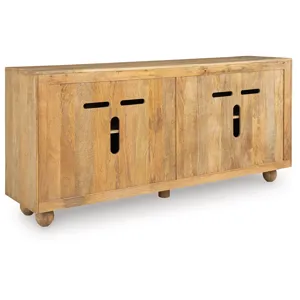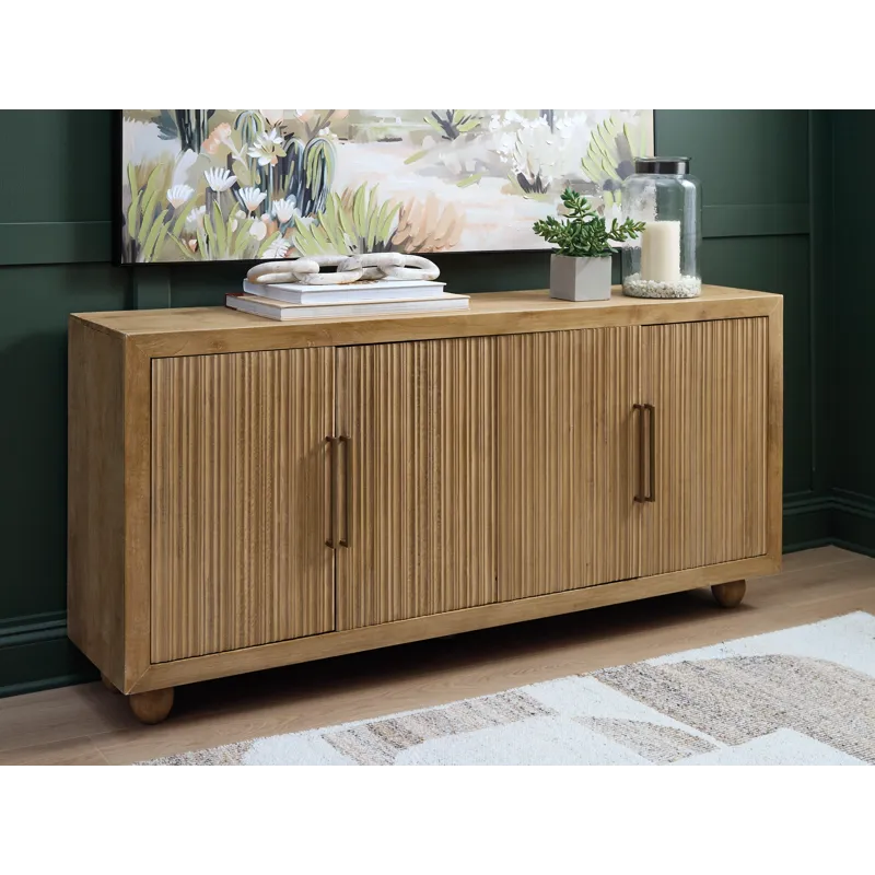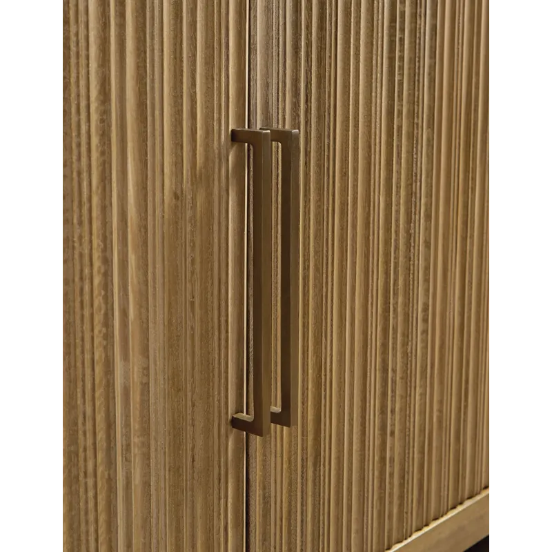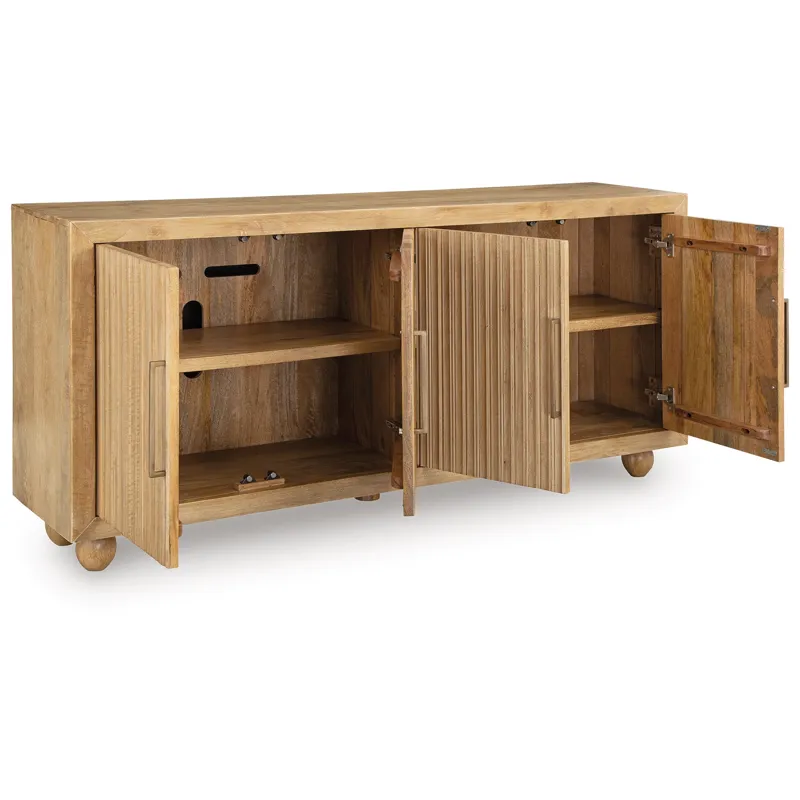 This accent cabinet offers abundant storage with casually cool style and versatility. Its four doors, accented with fluting and goldtone metal pulls, conceal two fixed shelves perfect for dinnerware, cookbooks or anything you want to tuck away. The natural and cream antiqued finish over solid mango wood complements a wide range of decor, making it an easy addition to your living or dining area.